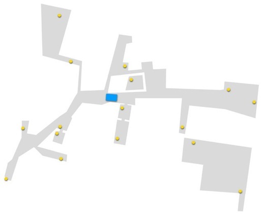 The Spontaneous Choir consisting of 16 singing zones and one central listening zone. The singing zones are distributed across the area of FARM such that no visual contact exists amongst them and between them and the listening zone.
